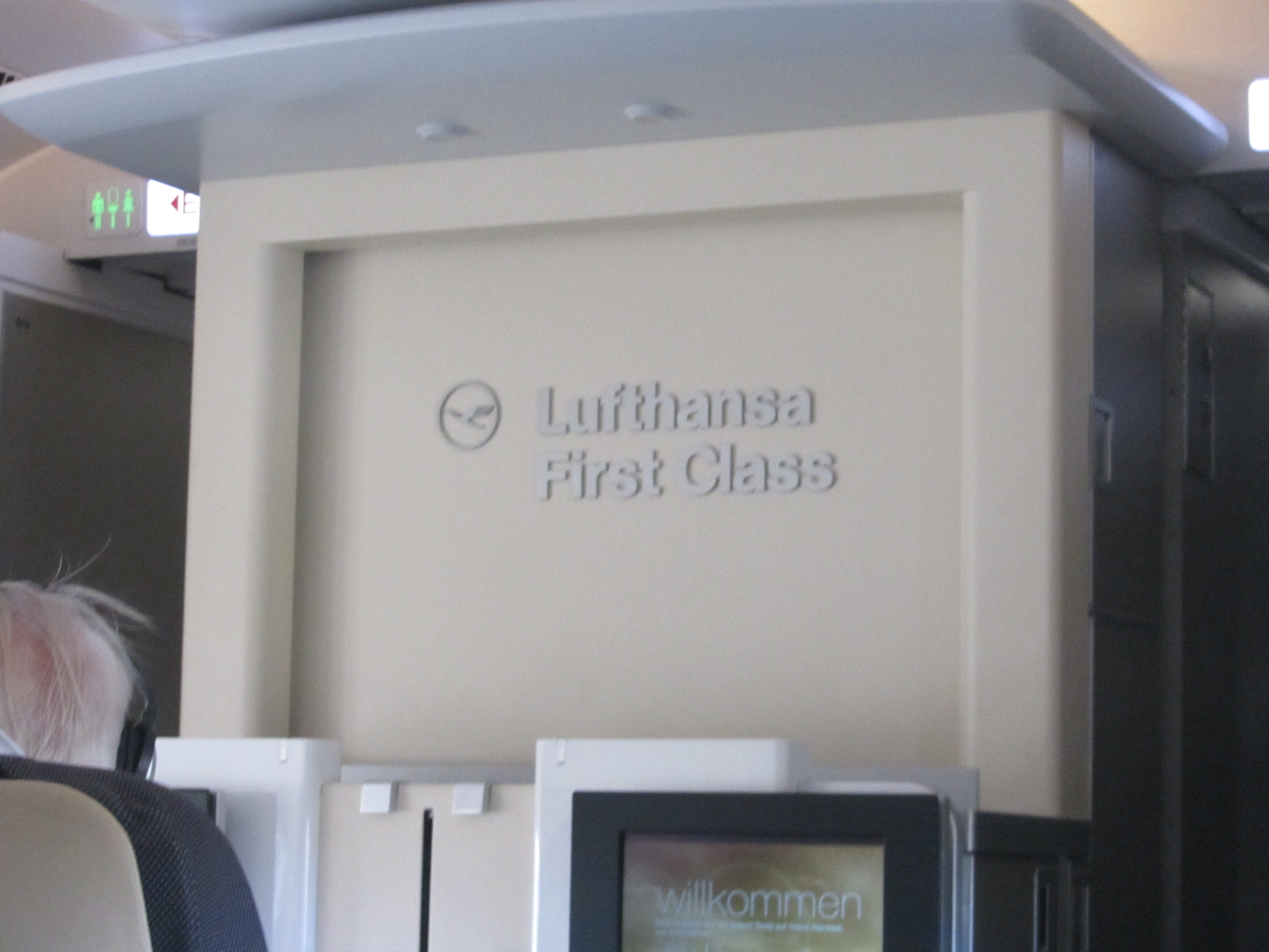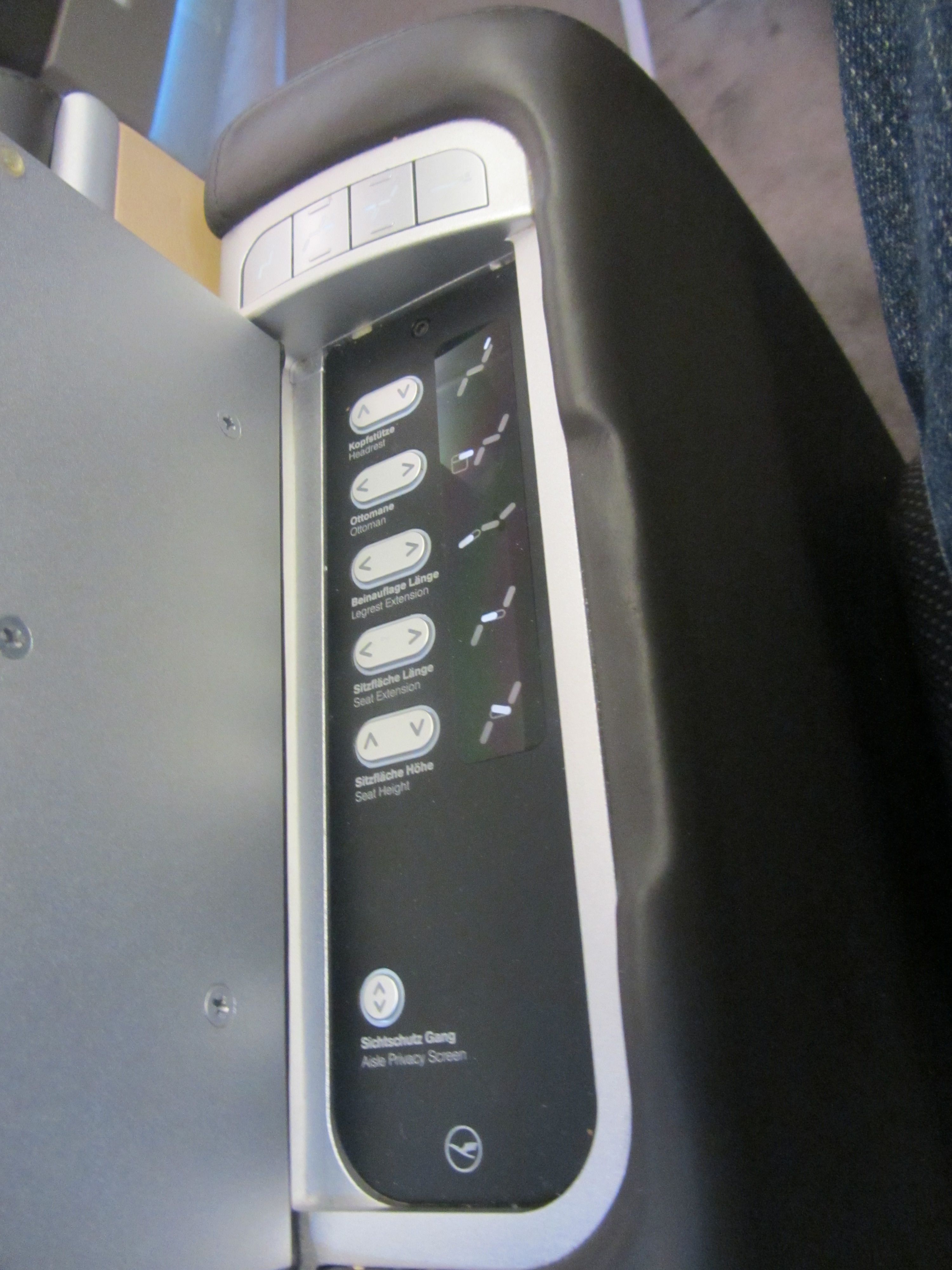While many airlines place their first class cabin behind the nose on their 747’s, Lufthansa has its on the upper deck. The 747 First Class differs a bit from those on other aircraft (such their A340) by featuring a dedicated bed next to the seat, minimizing the compromises necessary to get a seat that can morph into a bed at a moment’s notice.