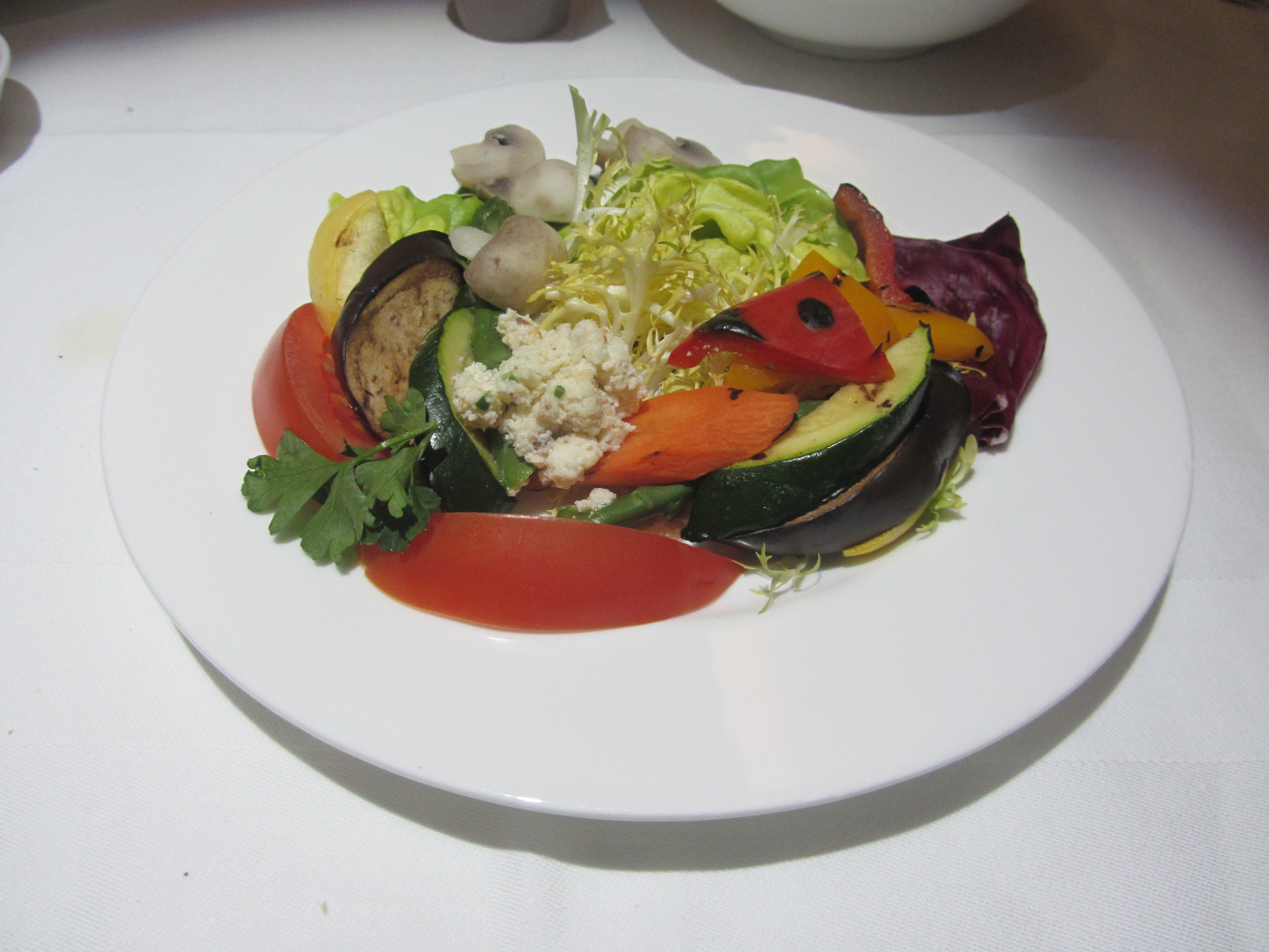 When United’s reservations system dropped this Lufthansa segment, I lost my vegetarian meal reservation. Nonetheless, the flight worked out and I was able to find suitable vegetarian options from the menu. I began with the salad and lettuce mousse.
